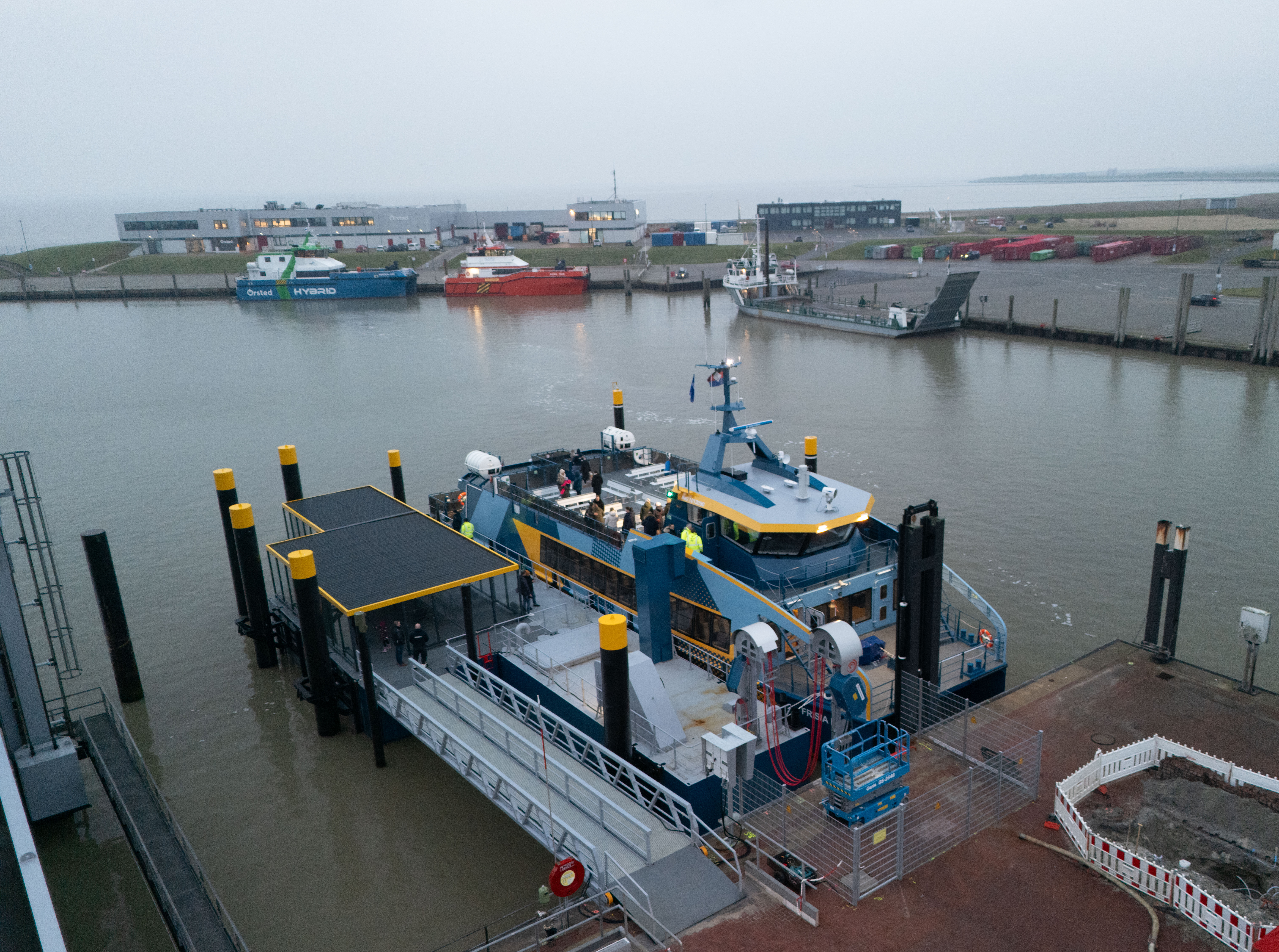 Der E-Kat hat eine Batteriekapazität von insgesamt 1,8 MWh. Der Energieverbrauch für eine Tour (Norddeich - Norderney - Norddeich) liegt bei ca. 700 kWh. Aufgeladen wird das Schiff an seinem Liegeplatz in Norddeich und benötigt dafür 28 Minuten Ladedauer. Dazu wird das Schiff über zwei wassergekühlte Ladestecker (MCS) mit dem Ladeturm verbunden.